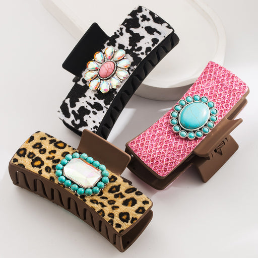 Precio original USD$1.92 - Precio original USD$1.92Precio original USD$1.92USD$3.45USD$3.45 - USD$3.45Precio actual USD$3.45Wholesale Leopard Leather Diamond-encrusted Turquoise Grab Clip Back Head Tie Hair Clip Women' s Hair Clip